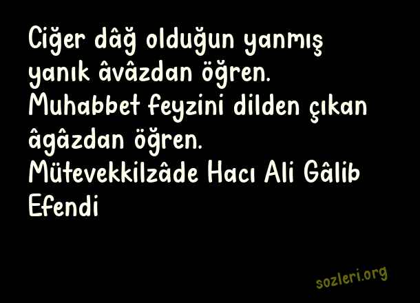 Ciğer dâğ olduğun yanmış yanık âvâzdan öğren. Muhabbet feyzini dilden çıkan âgâzdan öğren. Mütevekkilzâde Hacı Ali Gâlib Efendi ( Berceste Beyitler )