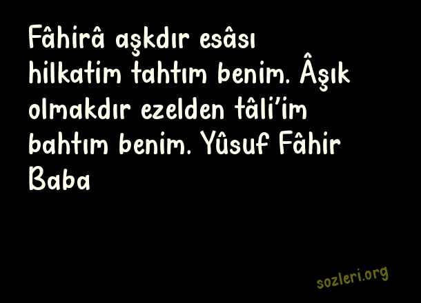 Fâhirâ aşkdır esâsı hilkatim tahtım benim. Âşık olmakdır ezelden tâli’im bahtım benim. Yûsuf Fâhir Baba ( Berceste Beyitler )