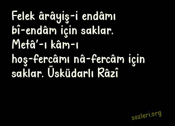 Felek ârâyiş-i endâmı bî-endâm için saklar. Metâ’-ı kâm-ı hoş-fercâmı nâ-fercâm için saklar. Üsküdarlı Râzî ( Berceste Beyitler )