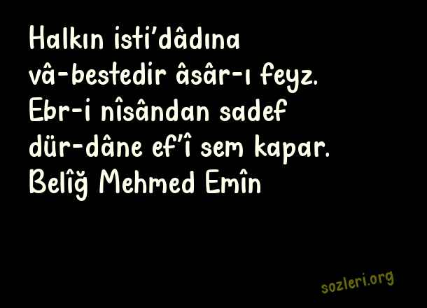 Halkın isti’dâdına vâ-bestedir âsâr-ı feyz. Ebr-i nîsândan sadef dür-dâne ef’î sem kapar. Belîğ Mehmed Emîn ( Berceste Beyitler )