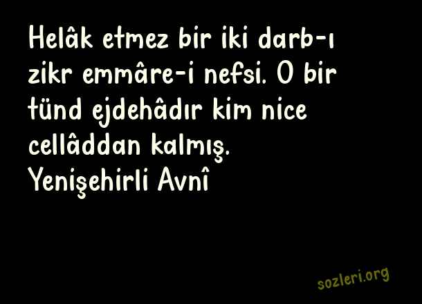 Helâk etmez bir iki darb-ı zikr emmâre-i nefsi. O bir tünd ejdehâdır kim nice cellâddan kalmış. Yenişehirli Avnî ( Berceste Beyitler )