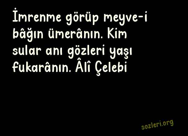 İmrenme görüp meyve-i bâğın ümerânın. Kim sular anı gözleri yaşı fukarânın. Âlî Çelebi ( Berceste Beyitler )