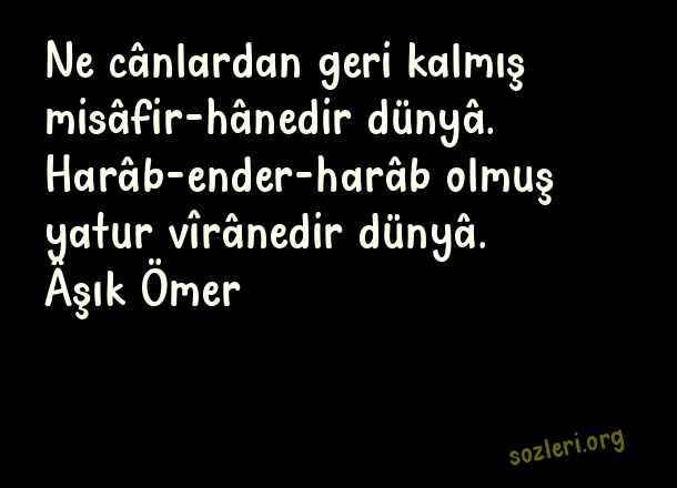 Ne cânlardan geri kalmış misâfir-hânedir dünyâ. Harâb-ender-harâb olmuş yatur vîrânedir dünyâ. Âşık Ömer ( Berceste Beyitler )