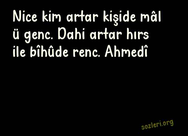 Nice kim artar kişide mâl ü genc. Dahi artar hırs ile bîhûde renc. Ahmedî ( Berceste Beyitler )