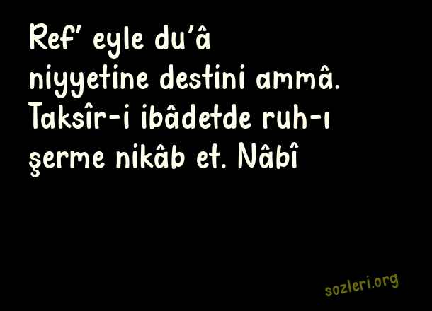 Ref’ eyle du’â - Berceste Beyitler .. Ref’ eyle du’â niyyetine destini ammâ. Taksîr-i ibâdetde ruh-ı şerme nikâb et. Nâbî ( Berceste Beyitler )