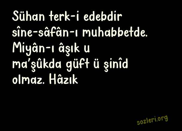 Sühan terk-i edebdir sîne-sâfân-ı muhabbetde. Miyân-ı âşık u ma’şûkda güft ü şinîd olmaz. Hâzık ( Berceste Beyitler )