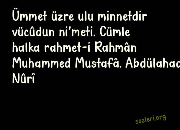 Ümmet üzre ulu minnetdir vücûdun ni’meti. Cümle halka rahmet-i Rahmân Muhammed Mustafâ. Abdülahad Nûrî ( Berceste Beyitler )