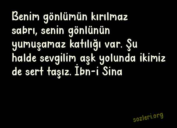 Benim gönlümün kırılmaz sabrı, senin gönlünün yumuşamaz katılığı var. Şu halde sevgilim aşk yolunda ikimiz de sert taşız. İbn-i Sina ( Bilim İnsanlarının )