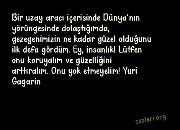 Bir uzay aracı içerisinde Dünya’nın yörüngesinde dolaştığımda, gezegenimizin ne kadar güzel olduğunu ilk defa gördüm. Ey, insanlık! Lütfen onu koruyalım ve güzelliğini arttıralım. Onu yok etmeyelim! Yuri Gagarin ( Bilim İnsanlarının )