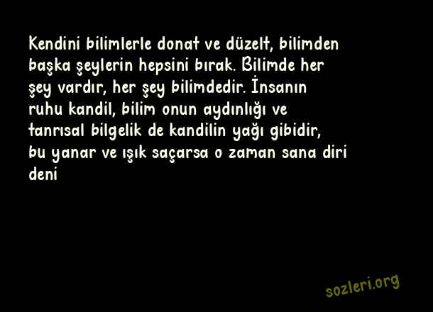 Kendini bilimlerle donat ve düzelt, bilimden başka şeylerin hepsini bırak. Bilimde her şey vardır, her şey bilimdedir. İnsanın ruhu kandil, bilim onun aydınlığı ve tanrısal bilgelik de kandilin yağı gibidir, bu yanar ve ışık saçarsa o zaman sana diri deni ( Bilim )