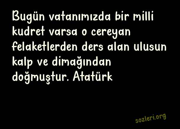 Bugün vatanımızda bir milli kudret varsa o cereyan felaketlerden ders alan ulusun kalp ve dimağından doğmuştur. Atatürk ( Birlik Beraberlik )