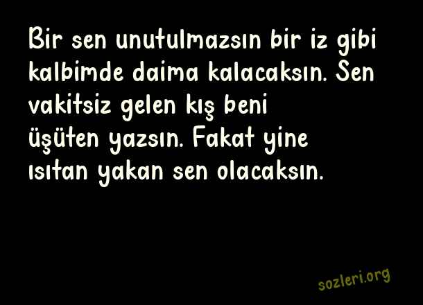 Bir sen unutulmazsın bir iz gibi kalbimde daima kalacaksın. Sen vakitsiz gelen kış beni üşüten yazsın. Fakat yine ısıtan yakan sen olacaksın. ( Bitmiş Aşk )