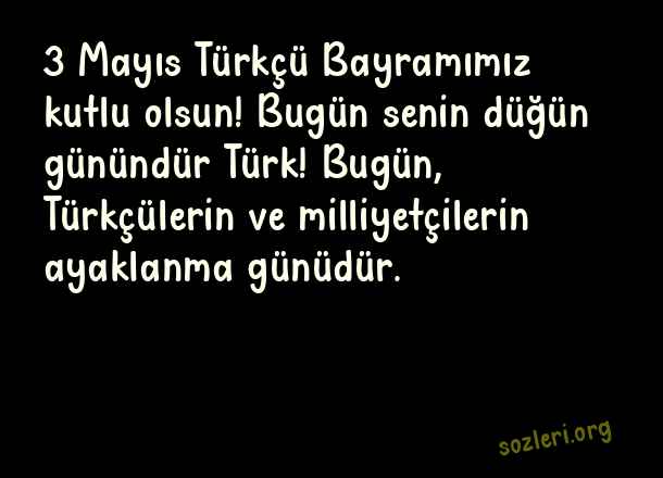 3 Mayıs Türkçü Bayramımız kutlu olsun! Bugün senin düğün günündür Türk! Bugün, Türkçülerin ve milliyetçilerin ayaklanma günüdür. ( Bozkurt )