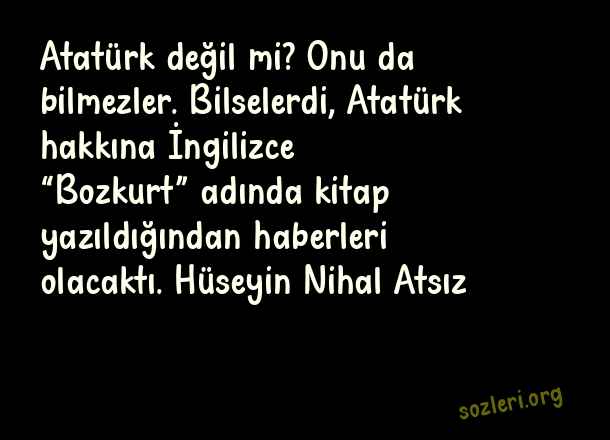 Atatürk değil mi? Onu da bilmezler. Bilselerdi, Atatürk hakkına İngilizce “Bozkurt” adında kitap yazıldığından haberleri olacaktı. Hüseyin Nihal Atsız ( Bozkurt )