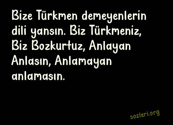 Bize Türkmen demeyenlerin dili yansın. Biz Türkmeniz, Biz Bozkurtuz, Anlayan Anlasın, Anlamayan anlamasın. ( Bozkurt )