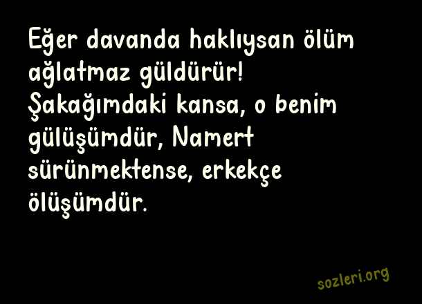 Eğer davanda haklıysan ölüm ağlatmaz güldürür! Şakağımdaki kansa, o benim gülüşümdür, Namert sürünmektense, erkekçe ölüşümdür. ( Bozkurt )