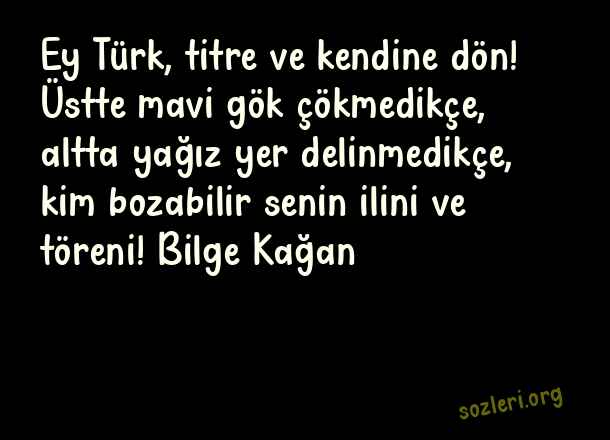 Ey Türk, titre ve kendine dön! Üstte mavi gök çökmedikçe, altta yağız yer delinmedikçe, kim bozabilir senin ilini ve töreni! Bilge Kağan ( Bozkurt )