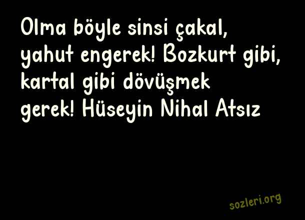 Olma böyle sinsi çakal, yahut engerek! Bozkurt gibi, kartal gibi dövüşmek gerek! Hüseyin Nihal Atsız ( Bozkurt )