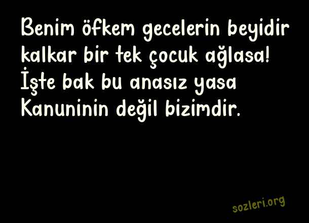 Benim öfkem gecelerin beyidir kalkar bir tek çocuk ağlasa! İşte bak bu anasız yasa Kanuninin değil bizimdir. ( Can Yücel )