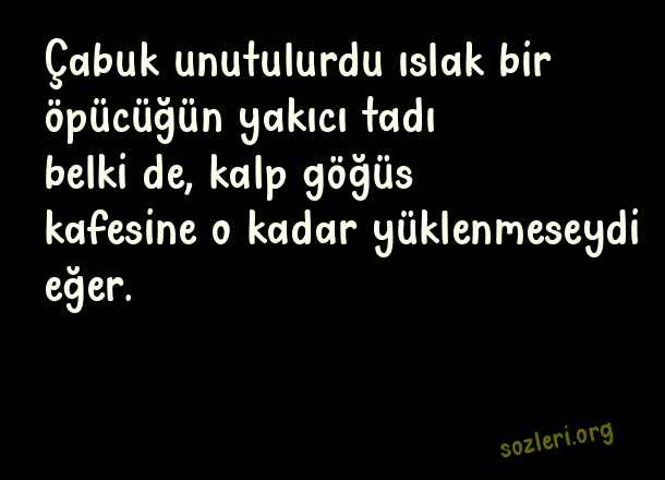 Çabuk unutulurdu ıslak bir öpücüğün yakıcı tadı belki de, kalp göğüs kafesine o kadar yüklenmeseydi eğer. ( Can Yücel )