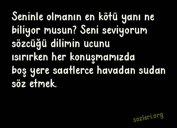 Seninle olmanın en kötü yanı ne biliyor musun? Seni seviyorum sözcüğü dilimin ucunu ısırırken her konuşmamızda boş yere saatlerce havadan sudan söz etmek. ( Can Yücel )