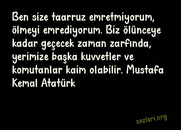 Ben size taarruz emretmiyorum, ölmeyi emrediyorum. Biz ölünceye kadar geçecek zaman zarfında, yerimize başka kuvvetler ve komutanlar kaim olabilir. Mustafa Kemal Atatürk ( Çanakkale İçin Söylenen Sözler )