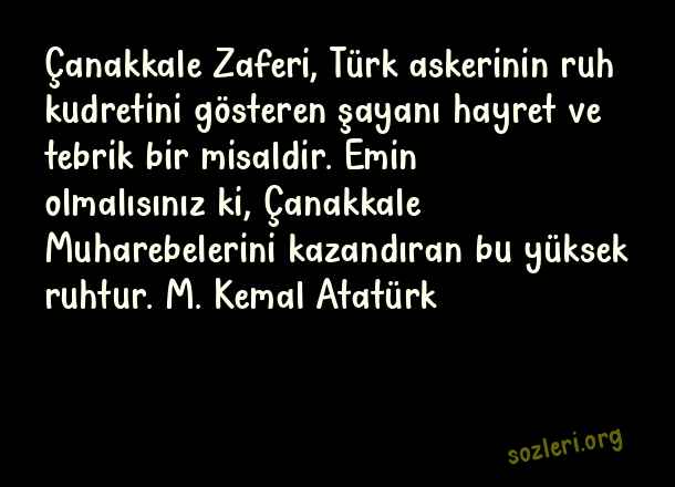 Çanakkale Zaferi, Türk askerinin ruh kudretini gösteren şayanı hayret ve tebrik bir misaldir. Emin olmalısınız ki, Çanakkale Muharebelerini kazandıran bu yüksek ruhtur. M. Kemal Atatürk ( Çanakkale İçin Söylenen Sözler )
