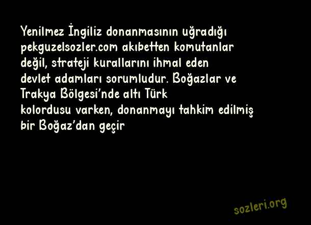 Yenilmez İngiliz donanmasının uğradığı akıbetten komutanlar değil, strateji kurallarını ihmal eden devlet adamları sorumludur. Boğazlar ve Trakya Bölgesi’nde altı Türk kolordusu varken, donanmayı tahkim edilmiş bir Boğaz’dan geçir ( Çanakkale İçin Söylenen Sözler )