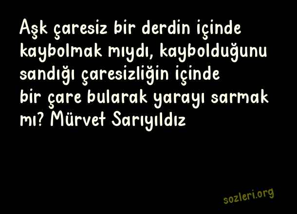 Aşk çaresiz bir derdin içinde kaybolmak mıydı, kaybolduğunu sandığı çaresizliğin içinde bir çare bularak yarayı sarmak mı? Mürvet Sarıyıldız ( Çaresizlik )