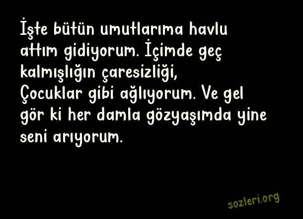 İşte bütün umutlarıma havlu attım gidiyorum. İçimde geç kalmışlığın çaresizliği, Çocuklar gibi ağlıyorum. Ve gel gör ki her damla gözyaşımda yine seni arıyorum. ( Çaresizlik )