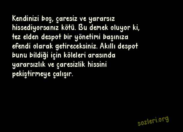Kendinizi boş, çaresiz ve yararsız hissediyorsanız kötü. Bu demek oluyor ki, tez elden despot bir yönetimi başınıza efendi olarak getireceksiniz. Akıllı despot bunu bildiği için köleleri arasında yararsızlık ve çaresizlik hissini pekiştirmeye çalışır. ( Çaresizlik )