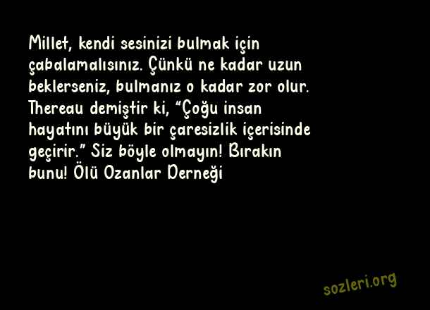 Millet, kendi sesinizi bulmak için çabalamalısınız. Çünkü ne kadar uzun beklerseniz, bulmanız o kadar zor olur. Thereau demiştir ki, “Çoğu insan hayatını büyük bir çaresizlik içerisinde geçirir.” Siz böyle olmayın! Bırakın bunu! Ölü Ozanlar Derneği ( Çaresizlik )