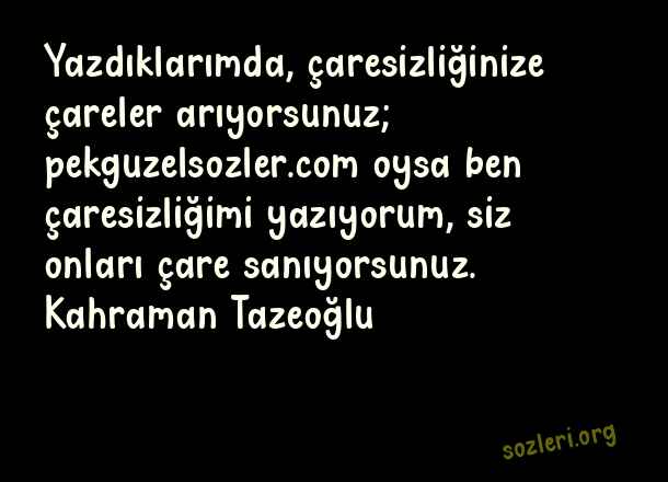 Yazdıklarımda, çaresizliğinize çareler arıyorsunuz; oysa ben çaresizliğimi yazıyorum, siz onları çare sanıyorsunuz. Kahraman Tazeoğlu ( Çaresizlik )