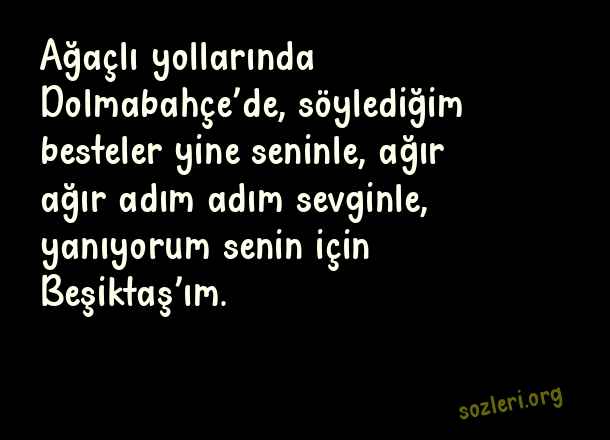 Ağaçlı yollarında Dolmabahçe’de, söylediğim besteler yine seninle, ağır ağır adım adım sevginle, yanıyorum senin için Beşiktaş’ım. ( Çarşı )