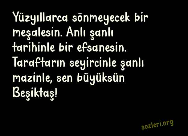 Yüzyıllarca sönmeyecek bir meşalesin. Anlı şanlı tarihinle bir efsanesin. Taraftarın seyircinle şanlı mazinle, sen büyüksün Beşiktaş! ( Çarşı )