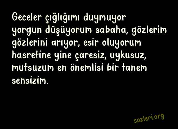 Geceler çığlığımı duymuyor yorgun düşüyorum sabaha, gözlerim gözlerini arıyor, esir oluyorum hasretine yine çaresiz, uykusuz, mutsuzum en önemlisi bir tanem sensizim. ( Çığlık )