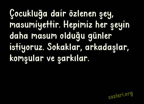 Çocukluğa dair özlenen şey, masumiyettir. Hepimiz her şeyin daha masum olduğu günler istiyoruz. Sokaklar, arkadaşlar, komşular ve şarkılar. ( Çocuğun Masumiyeti )
