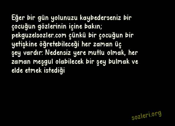 Eğer bir gün yolunuzu kaybederseniz bir çocuğun gözlerinin içine bakın; çünkü bir çocuğun bir yetişkine öğretebileceği her zaman üç şey vardır: Nedensiz yere mutlu olmak, her zaman meşgul olabilecek bir şey bulmak ve elde etmek istediği ( Çocuğun Masumiyeti )