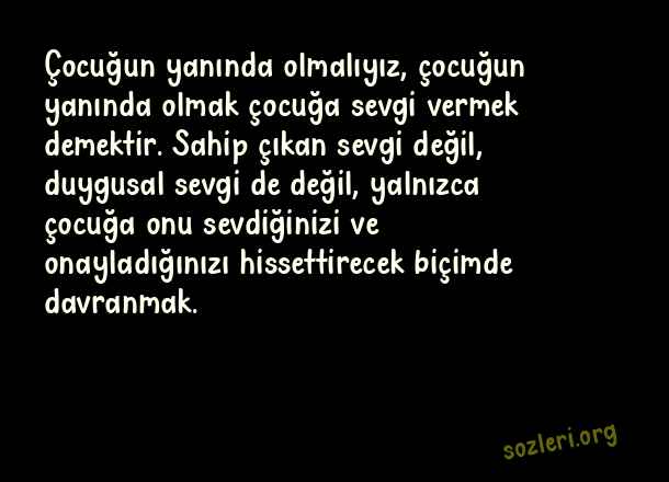 Çocuğun yanında olmalıyız, çocuğun yanında olmak çocuğa sevgi vermek demektir. Sahip çıkan sevgi değil, duygusal sevgi de değil, yalnızca çocuğa onu sevdiğinizi ve onayladığınızı hissettirecek biçimde davranmak. ( Çocuklarla İlgili Güzel Sözler )