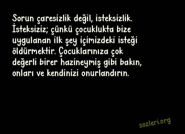 Sorun çaresizlik değil, isteksizlik. İsteksiziz; çünkü çocuklukta bize uygulanan ilk şey içimizdeki isteği öldürmektir. Çocuklarınıza çok değerli birer hazineymiş gibi bakın, onları ve kendinizi onurlandırın. ( Çocuklarla İlgili Güzel Sözler )