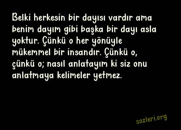 Belki herkesin bir dayısı vardır ama benim dayım gibi başka bir dayı asla yoktur. Çünkü o her yönüyle mükemmel bir insandır. Çünkü o, çünkü o; nasıl anlatayım ki siz onu anlatmaya kelimeler yetmez. ( Dayıya Güzel Sözler )