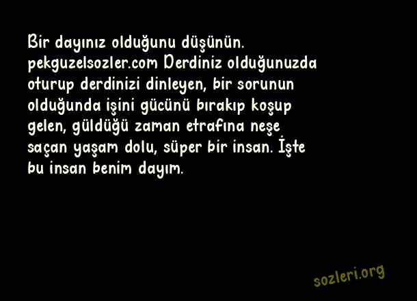 Bir dayınız olduğunu düşünün. Derdiniz olduğunuzda oturup derdinizi dinleyen, bir sorunun olduğunda işini gücünü bırakıp koşup gelen, güldüğü zaman etrafına neşe saçan yaşam dolu, süper bir insan. İşte bu insan benim dayım. ( Dayıya Güzel Sözler )