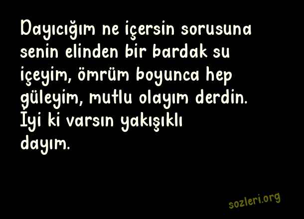 Dayıcığım ne içersin sorusuna senin elinden bir bardak su içeyim, ömrüm boyunca hep güleyim, mutlu olayım derdin. İyi ki varsın yakışıklı dayım. ( Dayıya Güzel Sözler )