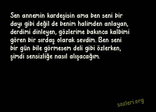 Sen annemin kardeşisin ama ben seni bir dayı gibi değil de benim halimden anlayan, derdimi dinleyen, gözlerime bakınca kalbimi gören bir sırdaş olarak sevdim. Ben seni bir gün bile görmesem deli gibi özlerken, şimdi sensizliğe nasıl alışacağım. ( Dayıya Güzel Sözler )