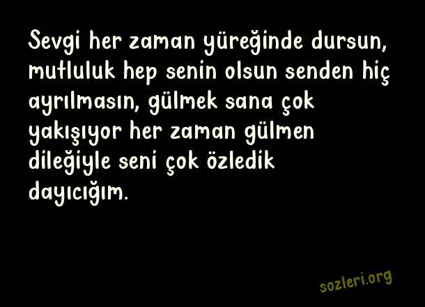 Sevgi her zaman yüreğinde dursun, mutluluk hep senin olsun senden hiç ayrılmasın, gülmek sana çok yakışıyor her zaman gülmen dileğiyle seni çok özledik dayıcığım. ( Dayıya Güzel Sözler )