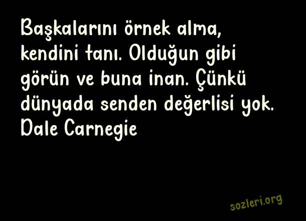 Başkalarını örnek alma, kendini tanı. Olduğun gibi görün ve buna inan. Çünkü dünyada senden değerlisi yok. Dale Carnegie ( Değerlisin )
