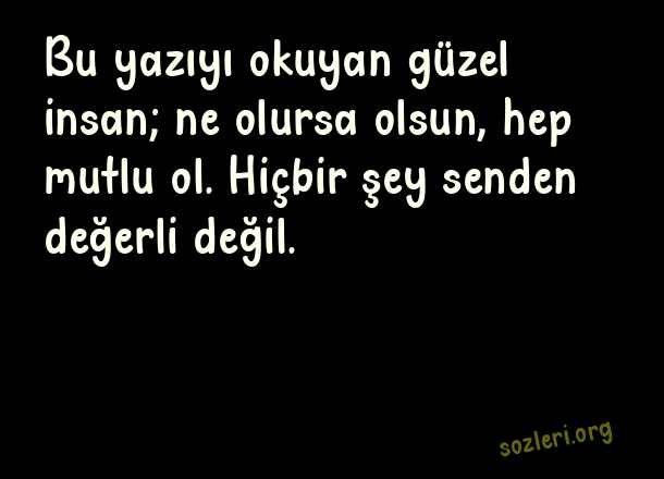 Bu yazıyı okuyan güzel insan; ne olursa olsun, hep mutlu ol. Hiçbir şey senden değerli değil. ( Değerlisin )