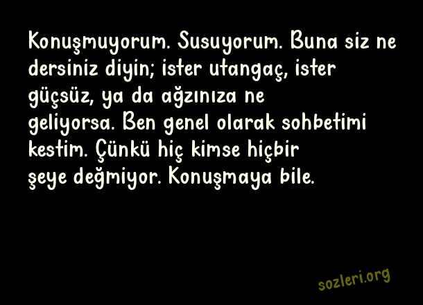 Konuşmuyorum. Susuyorum. Buna siz ne dersiniz diyin; ister utangaç, ister güçsüz, ya da ağzınıza ne geliyorsa. Ben genel olarak sohbetimi kestim. Çünkü hiç kimse hiçbir şeye değmiyor. Konuşmaya bile. ( Değmeyen İnsanlara Sözler )