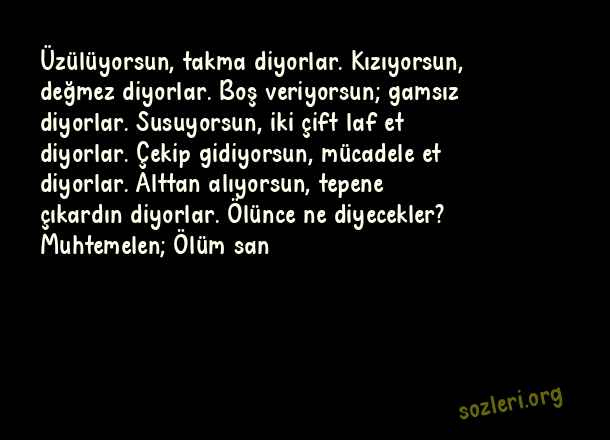 Üzülüyorsun, takma diyorlar. Kızıyorsun, değmez diyorlar. Boş veriyorsun; gamsız diyorlar. Susuyorsun, iki çift laf et diyorlar. Çekip gidiyorsun, mücadele et diyorlar. Alttan alıyorsun, tepene çıkardın diyorlar. Ölünce ne diyecekler? Muhtemelen; Ölüm san ( Değmeyen İnsanlara Sözler )