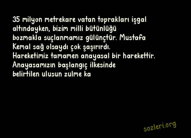 35 milyon metrekare vatan toprakları işgal altındayken, bizim milli bütünlüğü bozmakla suçlanmamız gülünçtür. Mustafa Kemal sağ olsaydı çok şaşırırdı. Hareketimiz tamamen anayasal bir harekettir. Anayasamızın başlangıç ilkesinde belirtilen ulusun zulme ka ( Deniz Gezmiş )